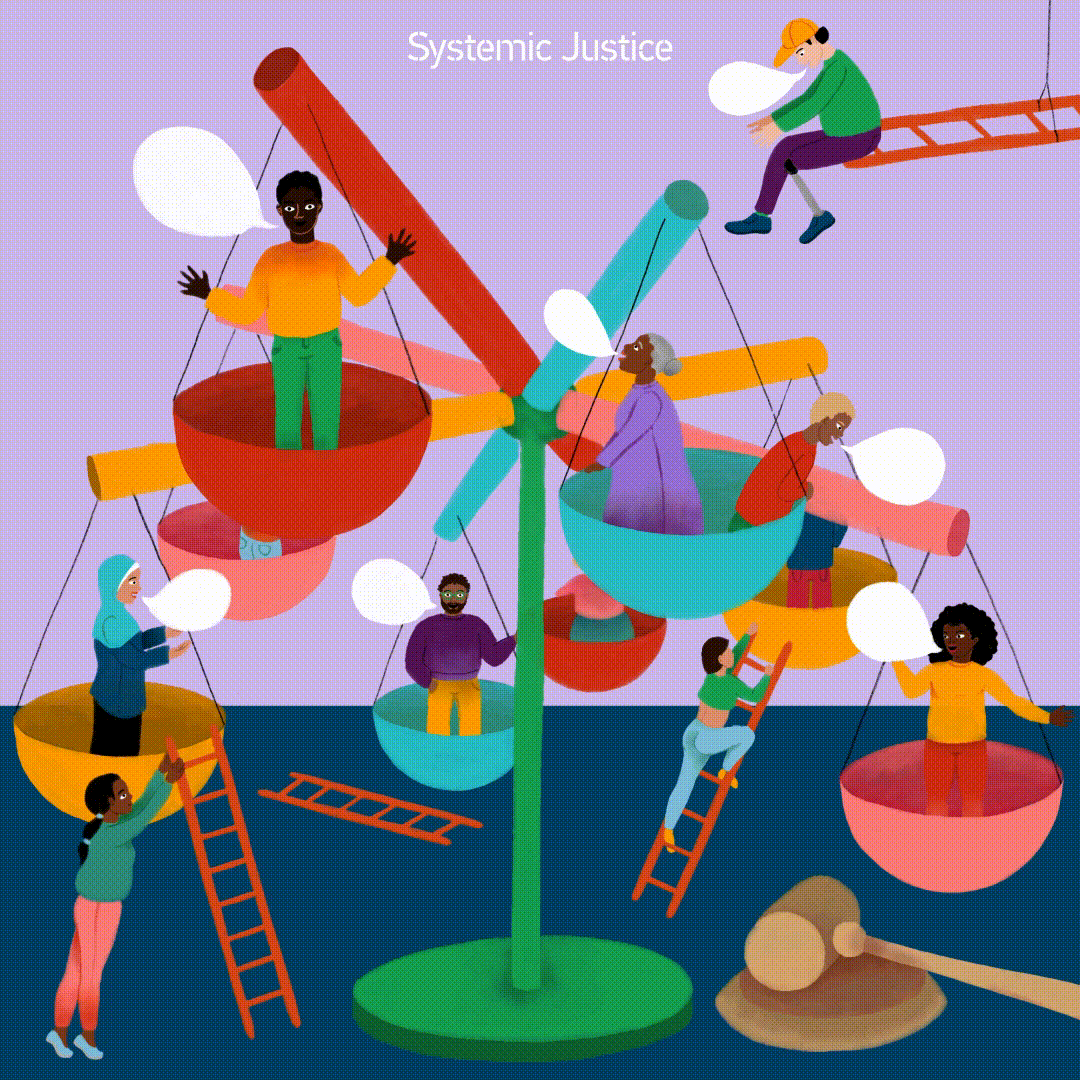 Systemic Justice approaches its work through an intersectional lens that centres how an individual’s social or political identity and personal characteristics can overlap and combine to create different modes of discrimination, exclusion, and oppression. Illustration: Hélène Baum