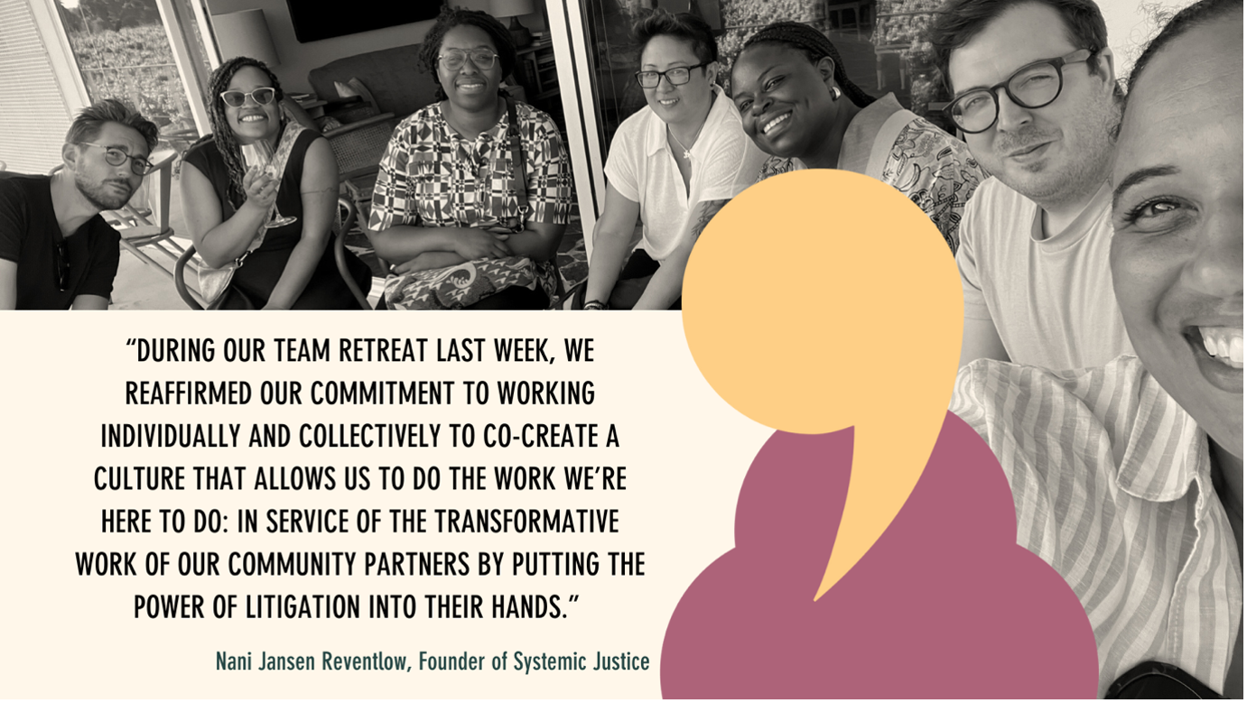 I wrote these words in early 2022, a few months after I started working full time on building Systemic Justice. The questions I shared then were a central part of our work from the very beginning – and they remain so to this day. Just like our mission was clear from the outset (to radically transform how the law works for communities that are fighting for racial, social, and economic justice), we understood that you cannot make change out in the world if you do not start from within your own organisation.