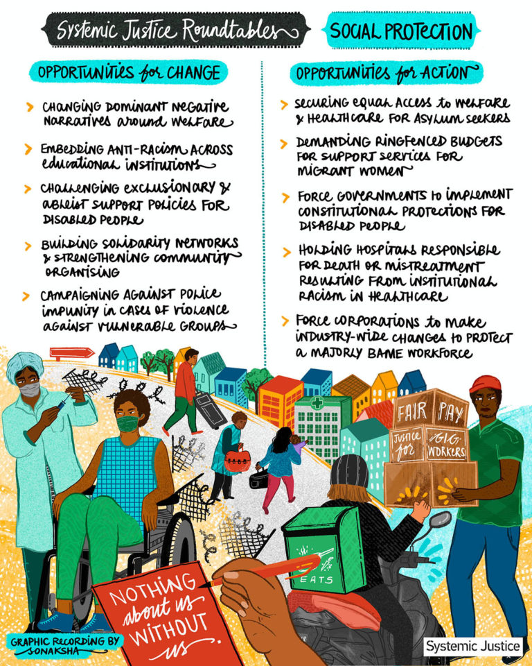 The conversations at our roundtable on social protection last week showed that, increasingly, social protection is being denied as a deliberate strategy of exclusion against those who are politically underrepresented and those who belong to groups and communities that are systemically prejudiced against as undeserving or ineligible for governmental assistance and support. Much of the burden to address essential needs for marginalised and racialised people ends up with (civil) society. As one participant noted: “Governments promote the rescue industry.”  This dangerous shift is harmful, with a political disdain for the dignity of the most marginalised and vulnerable across our societies. This can lead to the most extreme of consequences: death. Yet, “Governments deny any accountability towards welfare by treating each person’s death individually, without looking for patterns or at the context.”