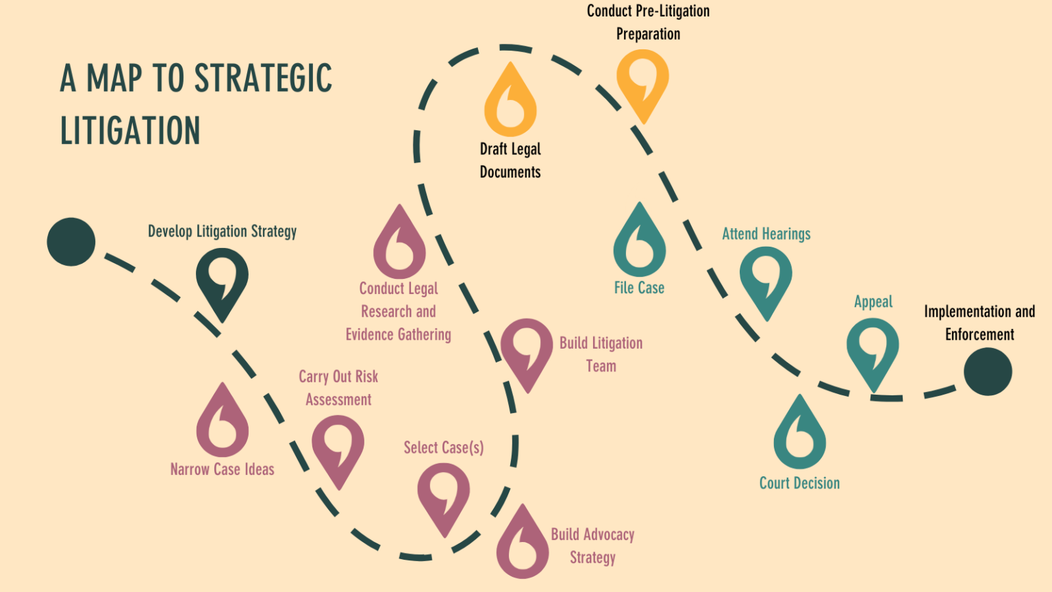 Through this process of designing a litigation strategy, case ideas will surface and will need to be further explored and narrowed. Once a set and sequence of cases has been established that best aligns with and supports the strategy, these cases then need to be “built”. Depending on the case, this process can take time. Legal research will need to be conducted. A process of evidence-gathering will need to be initiated. Movement and team building around a case will need to take place, and further resources will need to be acquired. Furthermore, an advocacy and communications strategy will need to be developed around the case.
