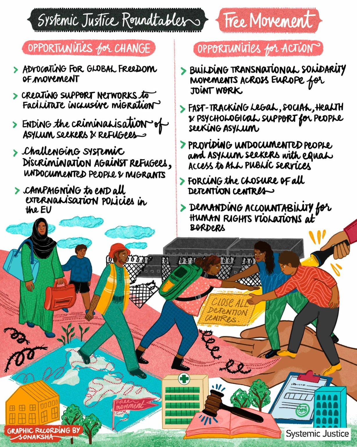 Big and bold solutions, while working collectively across intersecting issues, paves the way from “Fortress Europe” to a migration system that is just for everyone. Graphic record by Sonaksha.
