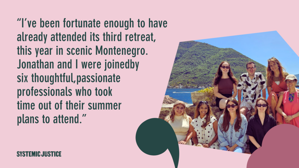 I’ve been fortunate enough to have already attended its third retreat, this year in scenic Montenegro. Jonathan and I were joined by six thoughtful, passionate professionals who took time out of their summer plans to attend. We considered privilege and positionality and how to connect better with affected communities. We also started planning our next year of learning and growing together. Thirty organisations are already part of the community, and I look forward to its expansion and continued success.